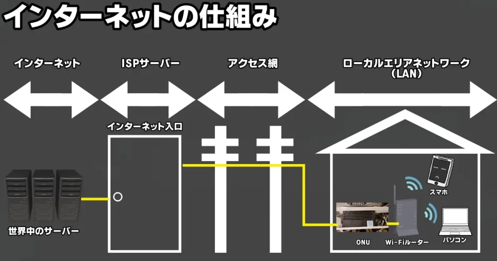 - インターネットの構造:家から光ケーブルを伝って電柱を通り通信事業者の局舎まで繋がっていて、最後はプロバイダのサーバーへ