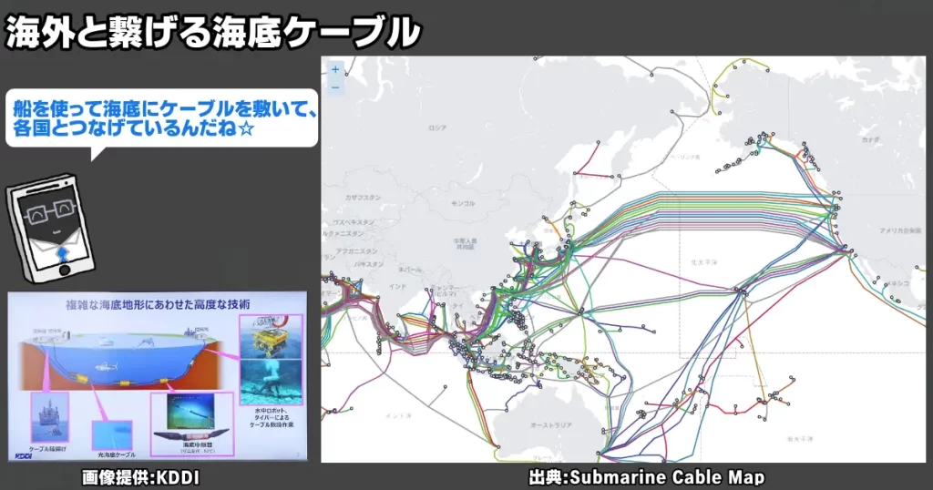 海外のサーバーには海底ケーブルで海を渡って接続されています。これも通信事業者が船を使ってケーブルを海底に敷いたりメンテナンスを日々行ってくれています。